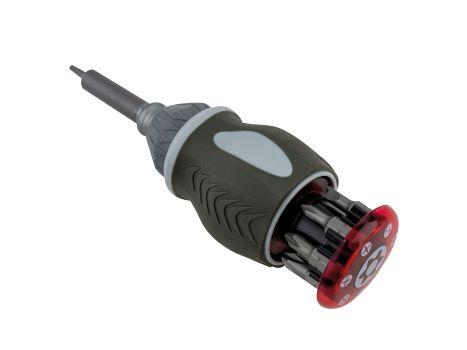 Ergonomiczna, antypoślizgowa rękojeść śrubokrętu gwarantuje komfortową pracę, a także dobrą kontrolę nad narzędziem podczas wykonywania precyzyjnych zadań. Końcówki przechowywane są wewnątrz rękojeści.
