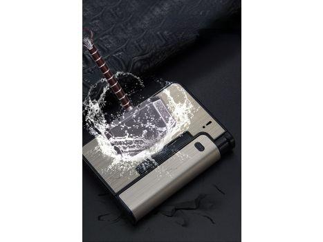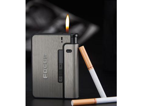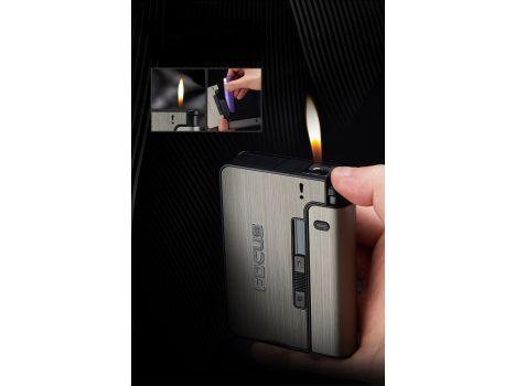 Papierośnica aluminiowa z automatycznym podajnikiem i miejscem na zapalniczkę.