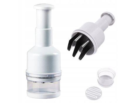Produkt posiada solidną konstrukcję, przy długości całkowitej 22 cm i średnicy ok. 8,5 cm, co pozwala na wygodne trzymanie oraz operowanie jedną ręką. Obudowa w kolorze białym, łatwa do utrzymania w czystości — demontowalne elementy ułatwiają mycie, a prostota działania zapewnia szybkie przygotowanie surówek, sałatek, przypraw czy dodatków do dań.
