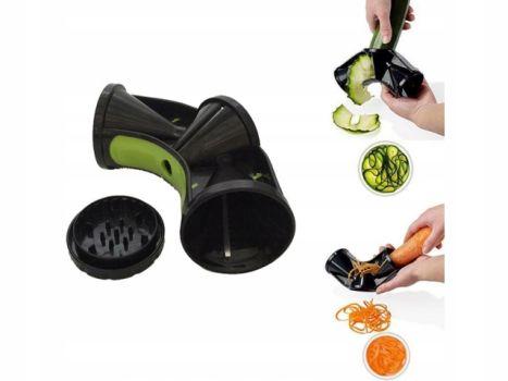 Wystarczy włożyć dowolne warzywo i przekręcać nim by powstało warzywne spaghetti. Trójstronna temperówka posiada trzy ostre noże dzięki którym można zrobić cieńsze lub grubsze paski oraz spiralne szerokie pasy.Do temperówki dołączona jest także zatyczka z kolcami w którą można wbić warzywo - znacznie ułatwia to pracę z narzędziem.