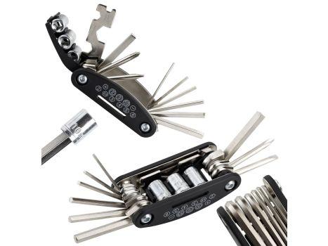 W zestawie znajdują się klucze imbusowe, wkrętaki, nasadki wraz z adapterem, a także klucze płaskie oraz specjalny klucz do szprych.