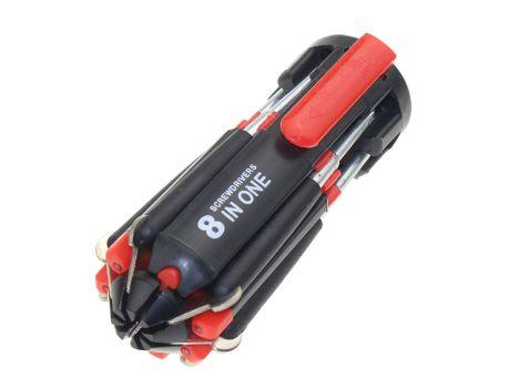 Kompaktowy zestaw narzędzi 8w1, idealny do użytku domowego, warsztatowego oraz w podróży. Zawiera różne końcówki śrubokrętów oraz wbudowaną latarkę LED, co czyni go wszechstronnym narzędziem w codziennych naprawach.